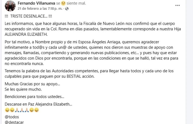 La noticia fue dada a conocer públicamente por el padrastro de la joven a través de Facebook, donde agradeció el apoyo recibido durante las semanas de búsqueda.