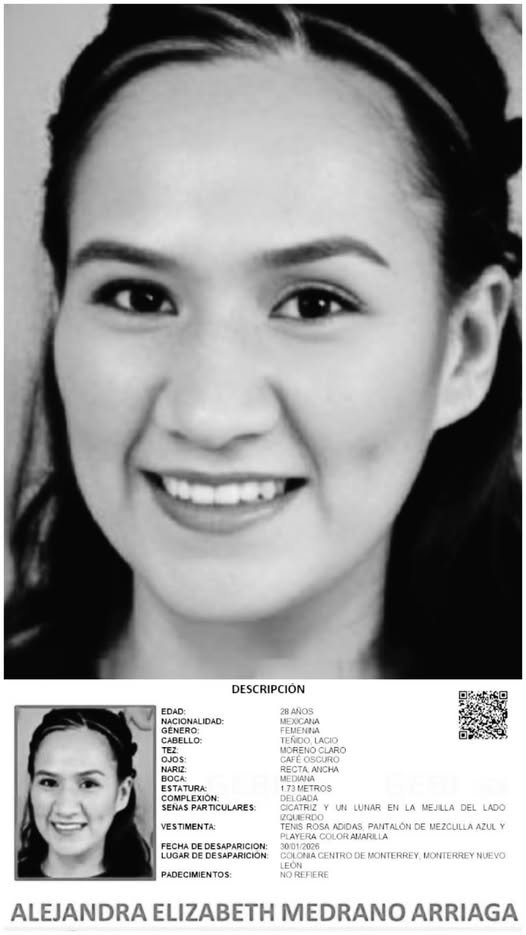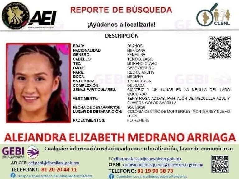De acuerdo con la ficha oficial de búsqueda, Alejandra fue vista por última vez el 30 de enero en el centro de la ciudad.