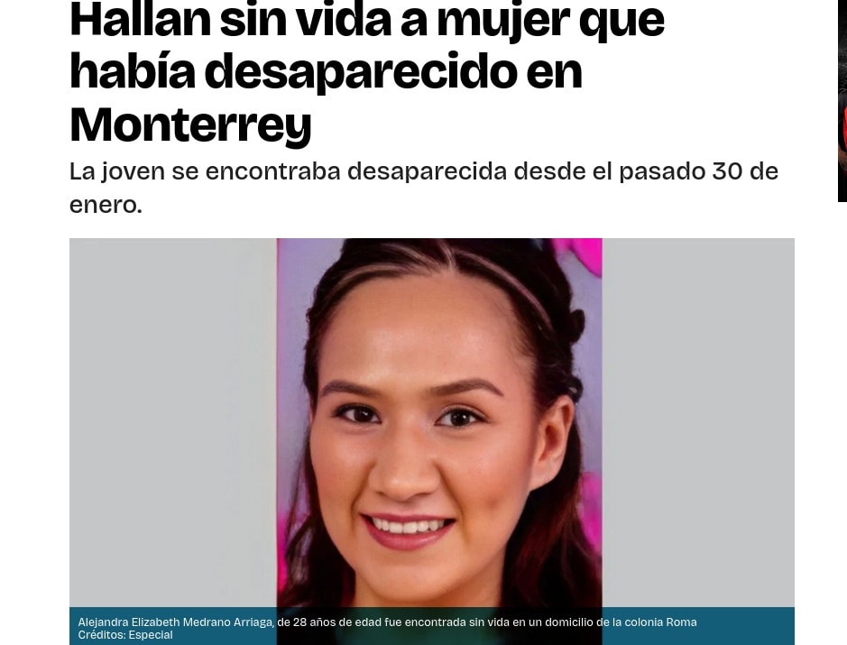 La Fiscalía General de Justicia del Estado de Nuevo León, México, confirmó que el cuerpo localizado el 18 de febrero en un domicilio de la colonia Roma, en Monterrey, corresponde a Alejandra Elizabeth M., de 28 años.