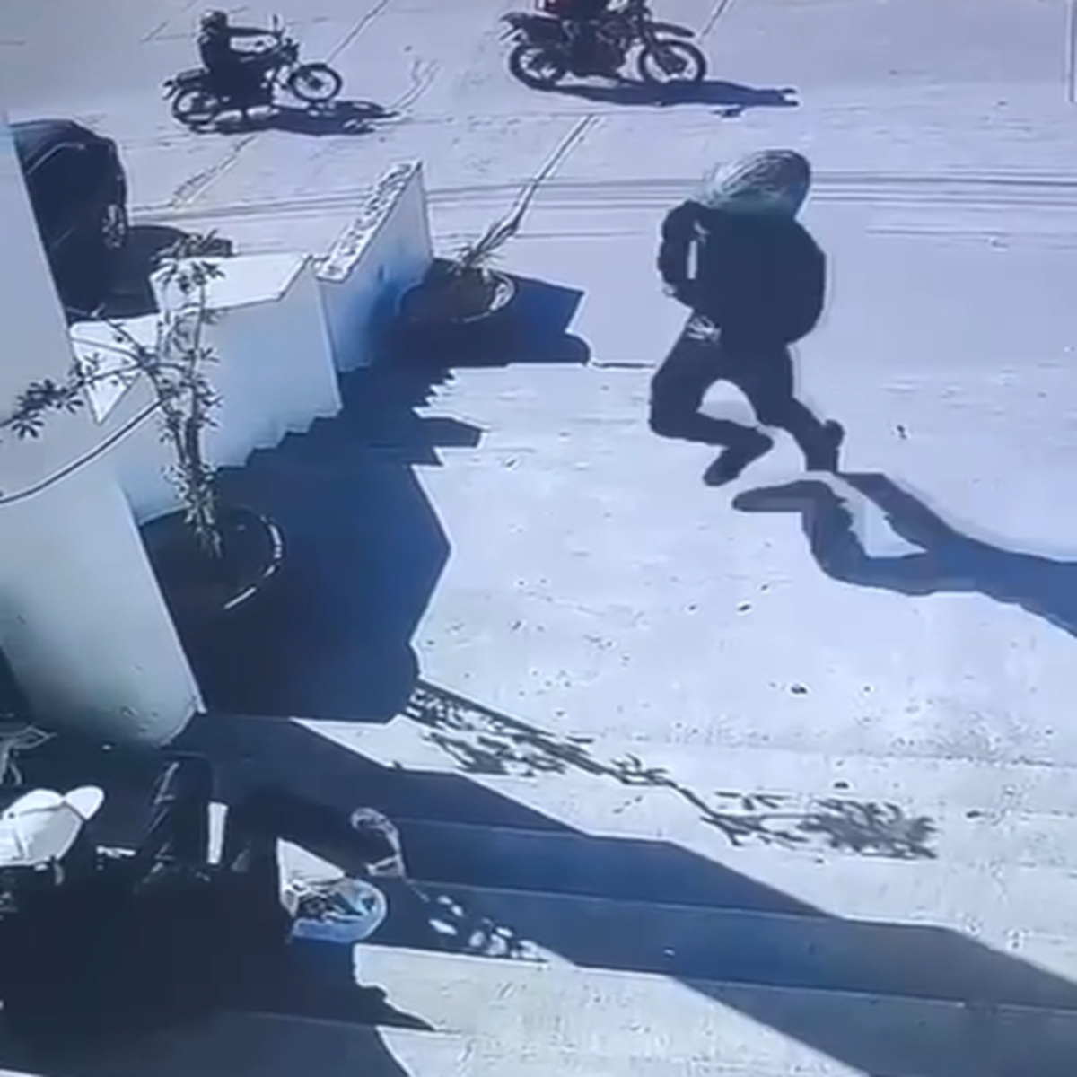 Uno de los ocupantes de la segunda motocicleta desciende del vehículo y camina hacia la entrada del centro de rehabilitación. Al subir las escaleras, el sujeto saca un arma de fuego y dispara contra dos hombres que se encontraban sentados en el lugar.