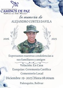 De acuerdo con la información preliminar, Alejandro Cortés Dávila, natural del corregimiento de Palenquito, jurisdicción del municipio de Pinillos, en el sur de Bolívar, fue encontrado sin signos vitales mientras cumplía funciones de centinela. El reporte inicial señala que presentaba un impacto causado por arma de fuego, situación que activó los protocolos judiciales correspondientes.