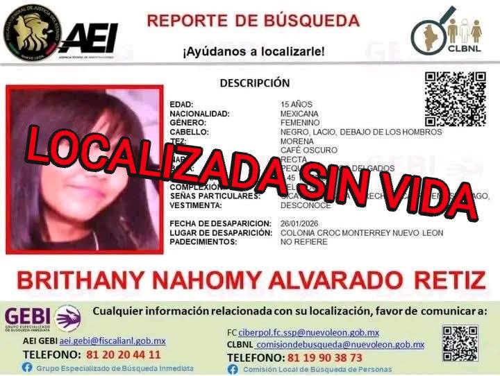 De acuerdo con información oficial, la víctima fue identificada como Brithany Nahomy Alvarado Reyes, de 15 años, cuyo paradero era desconocido desde hacía varios días.