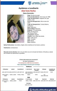 Las autoridades estatales confirmaron este jueves 9 de enero, la localización de los hermanos Elizabeth, Abel e Israel Soto Núñez, quienes habían sido reportados como desaparecidos desde el pasado lunes 6 de enero en el municipio de Aldama, Chihuahua, México. El hallazgo se realizó a un costado de la carretera de cuota Aldama–Ojinaga, a la altura del kilómetro 57, tras un aviso ciudadano al número de emergencias.