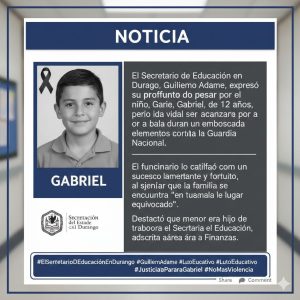 La tarde del martes 6 de enero, un incidente bajo investigación registrado sobre la carretera Durango–México conmocionó a la región tras dejar tres pérdidas humanas, entre ellas la de Gabriel, un menor de 12 años que se encontraba junto a su familia por una falla mecánica. El hecho involucró a elementos de la Guardia Nacional, confirmaron autoridades locales.