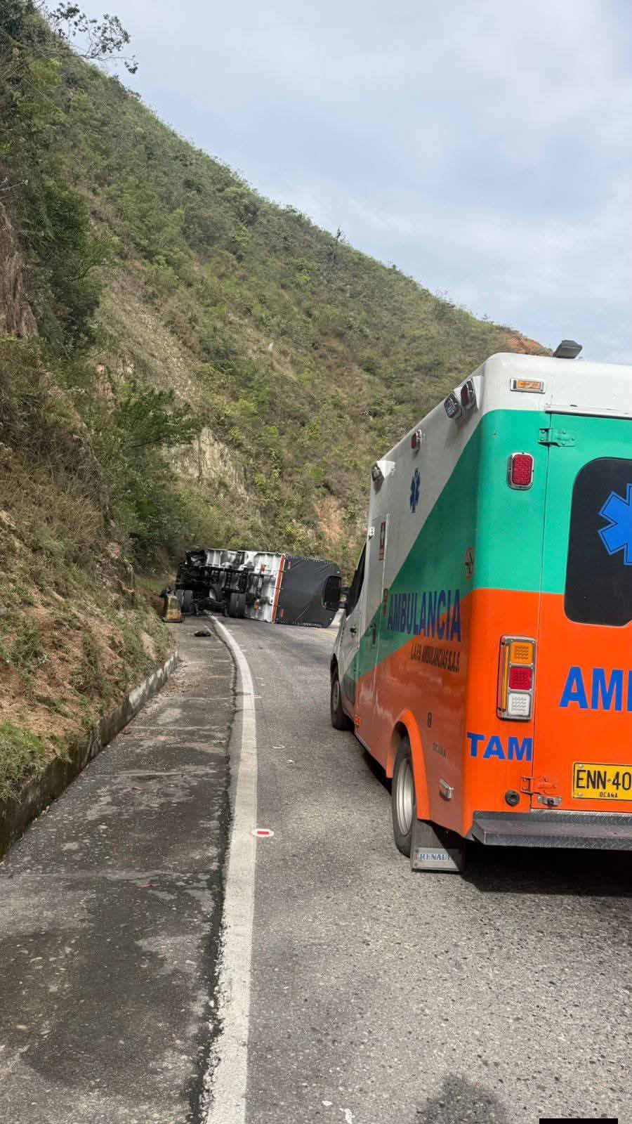 Conductores que pasaban por la zona observaron el camión volcado y alertaron a las autoridades. Minutos después, una ambulancia que regresaba a Ocaña desde Cúcuta pasó por el sitio y se detuvo.