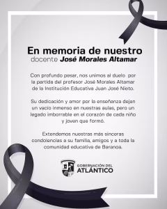 “Con profundo pesar nos unimos al duelo por la partida del profesor José Morales Altamar. Su dedicación y amor por la enseñanza dejan una huella imborrable en nuestra comunidad educativa”, expresó la administración departamental, extendiendo condolencias a familiares y colegas.