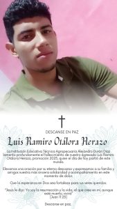 La Institución Educativa Técnica Agropecuaria Alejandro Durán Díaz manifestó su profundo pesar por la pérdida humana de Luis Ramiro Otálora Herazo, un joven de 23 años, egresado de la promoción 2025 del programa de jóvenes y adultos CLEI, quien perdió la vida tras un incidente laboral mientras trabajaba en una mina del municipio de Altos de Rosario, en el sur de Bolívar, Colombia.