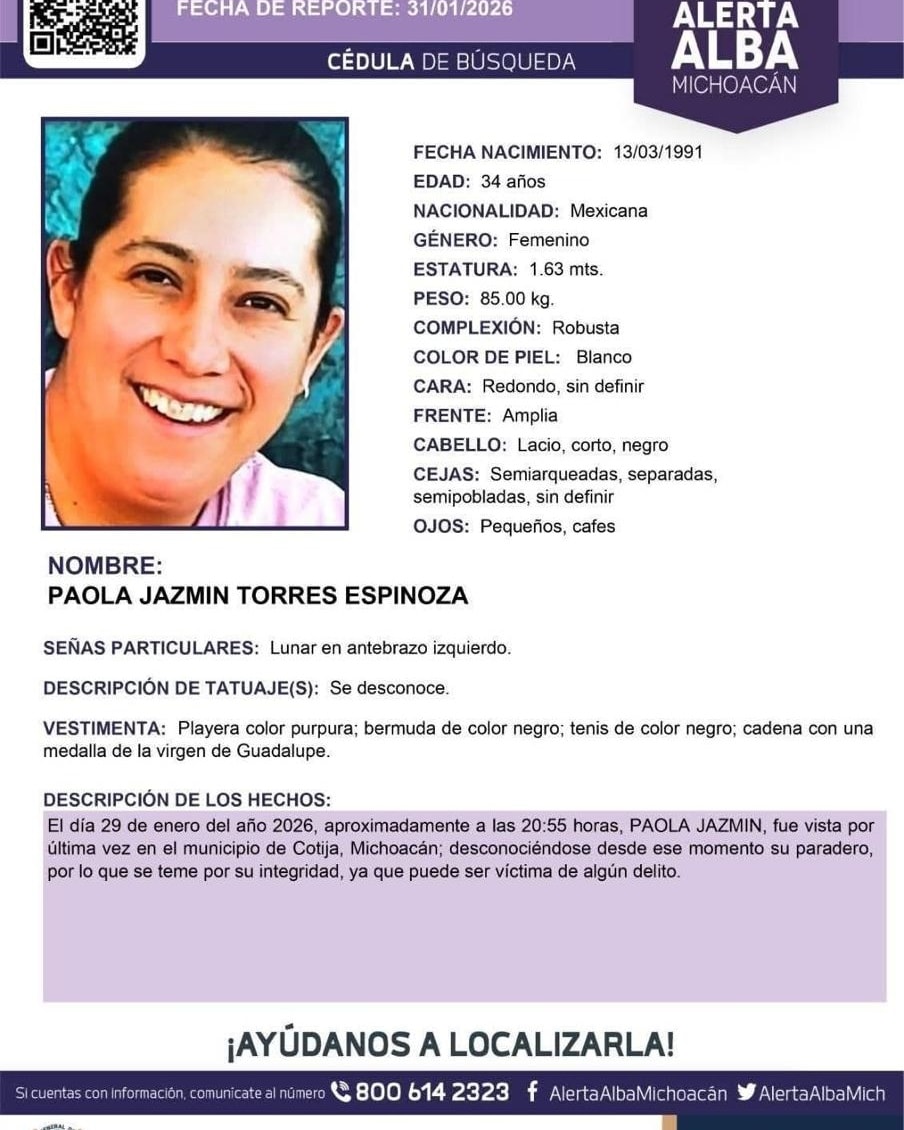 La mujer había sido vista por última vez en la población de Cotija, durante la mañana del 29 de enero, fecha desde la cual se desconocía su paradero, lo que generó preocupación entre sus allegados.