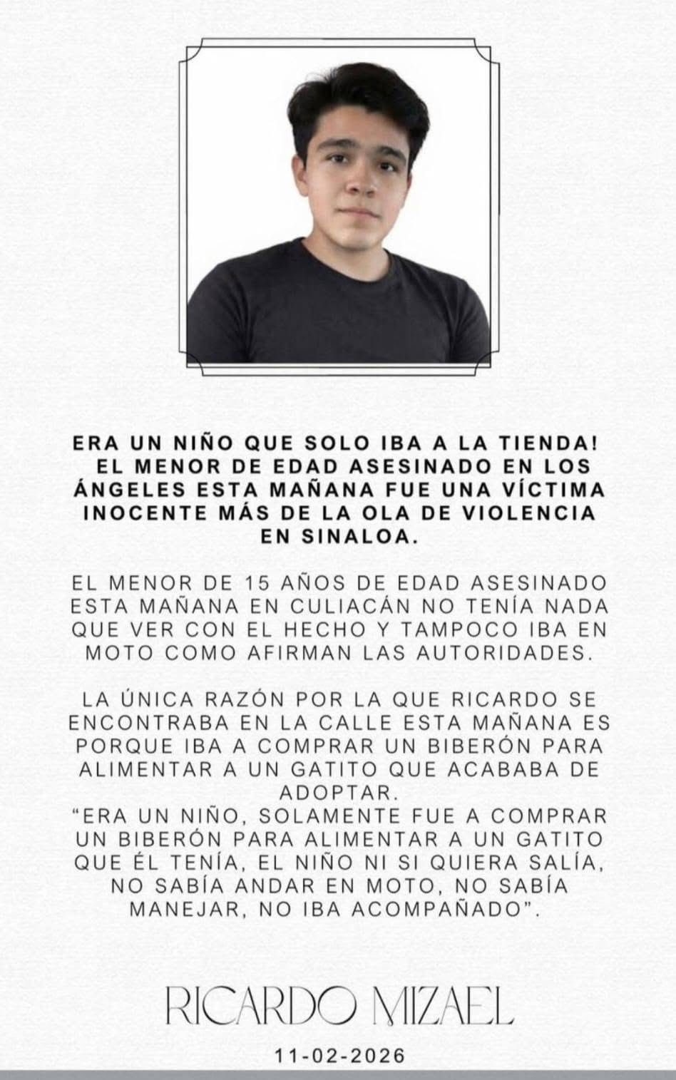 La comunidad de Culiacán, México, vive momentos de profunda tristeza tras la partida de Ricardo Mizael, un adolescente de 16 años que salió de su casa para cumplir una tarea sencilla y ya no regresó.