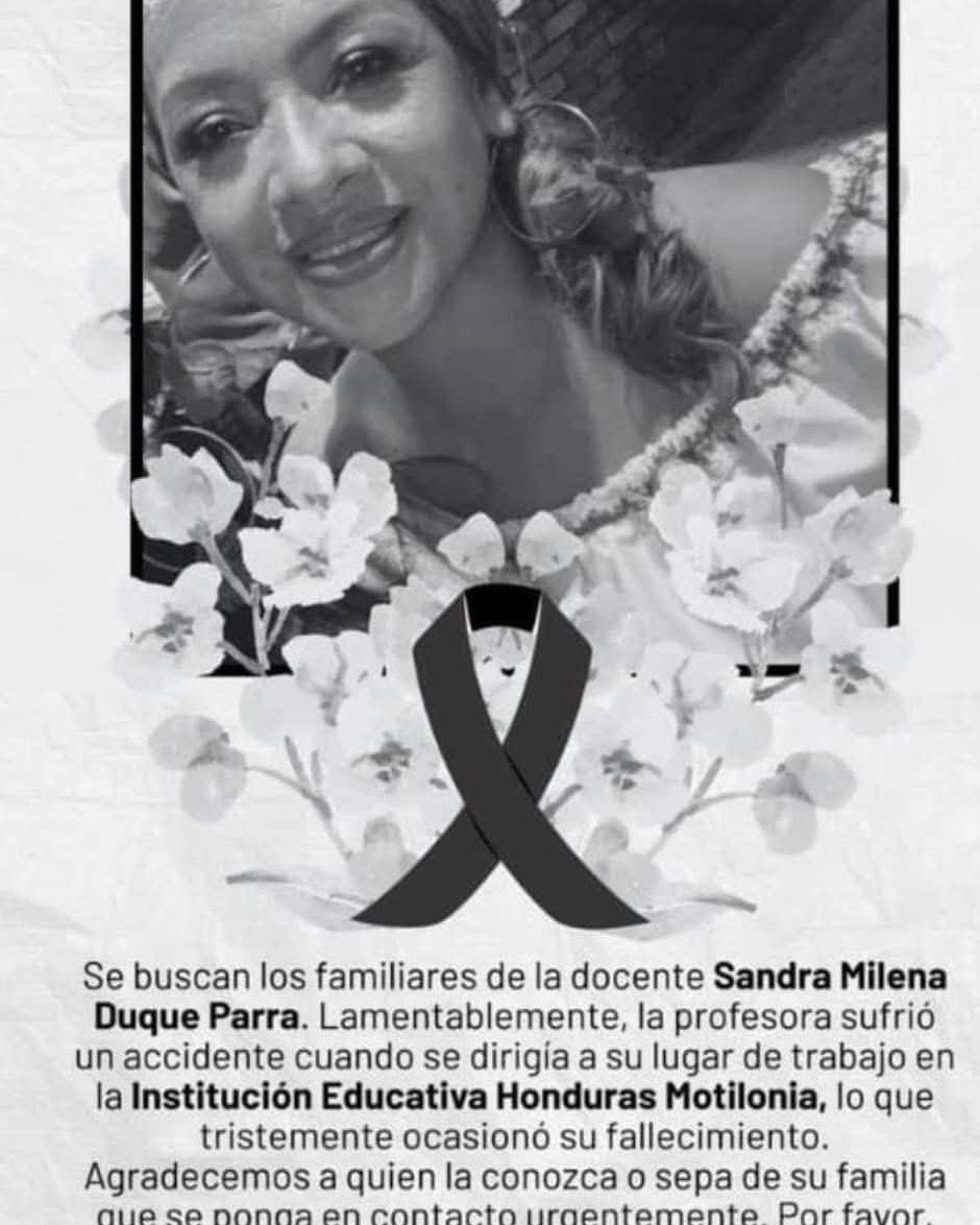 En la tarde del sábado 28 de febrero, la profesora Sandra Milena Duque Parra fue reportada como desaparecida por sus familiares en zona rural del municipio de Convención, Colombia.